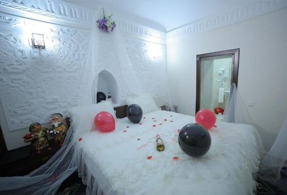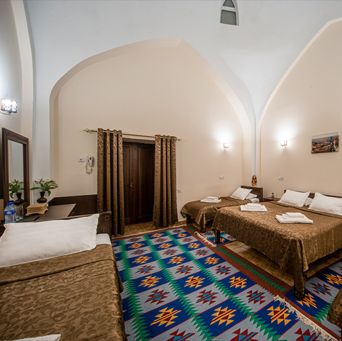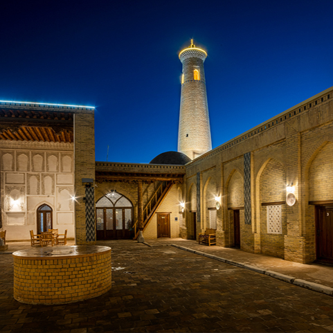 The Hotel “New Star Khiva” is located in Dishan Qala (“outside” fortress of Khiva), which is just a few meters away from Ichan Qala (Walls) and occupies a building of former madrasa of Muhammad Maxram with its minaret, which was built in 1903. It was erected by one of the most influential officials and advisers of Muhammad Rahim Khan II.